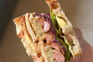 Some people question this, but the second protein needs to bring something to the sandwich that the first doesn't. So, for example, my family does sausage meat, we bake it on a tray and essentially have a loaf of sausage meat with our Christmas dinner. So that’s what I put in as a second protein. This needs to bring something else; in this case an element of fattiness, a different texture and dynamic. Some other examples would be pigs in blankets or ham.