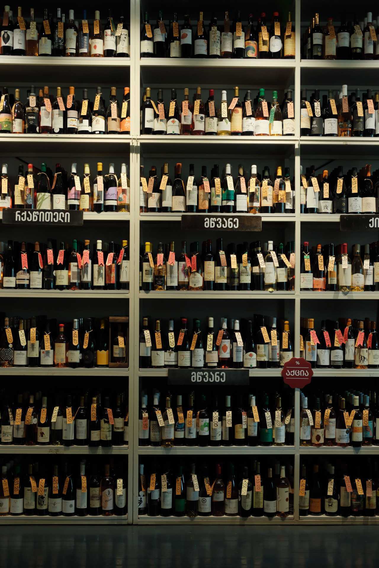 Wine bottles line the shelves in a specialist Georgian wine shop