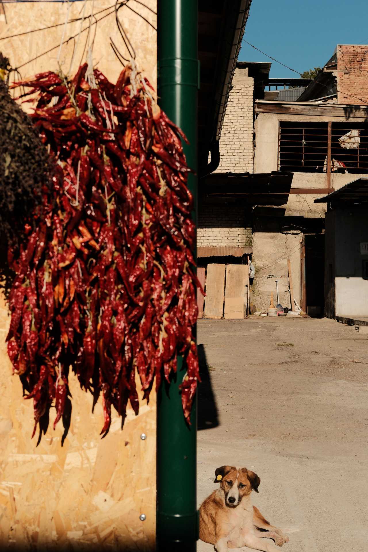 A dog rests underneath a string of sun-dried chillis