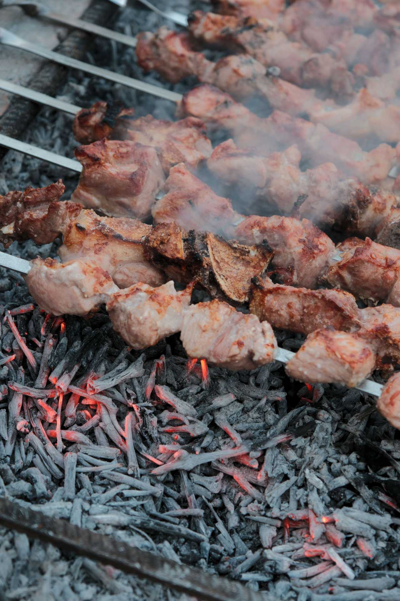 Skewers of meat cooking over charcoal