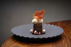 Cep and Westcombe cheddar agnoletti, with enoki and black truffle was declared a “genuine death-row dish” by my wife. While the Cornish cod was my favourite – the flaky fish drizzled in a cuttlefish broth on top, with pear spheres popping with sweetness to parry the richness of the sea leek and bone butter sauce.