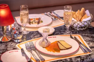 I mean, you’d be missing a trick not to have a glass of champagne, as it’s sort of a thing here. The cold bubbles will prep the stomach for what’s to follow. And while we’re on the subject of wine, we’d highly recommend that you order a bottle – Bob Bob Ricard, Bébé Bob, et al have some of the more honest markups in the capital. So there’s really no reason not to smash through a buttery bottle of white burgundy. And do you know what pairs well with burgundy? Caviar. There’s a lot of it here, from Siberian sturgeon to Beluga. Pile that on top of a blini crepe, and you’ll be in business.